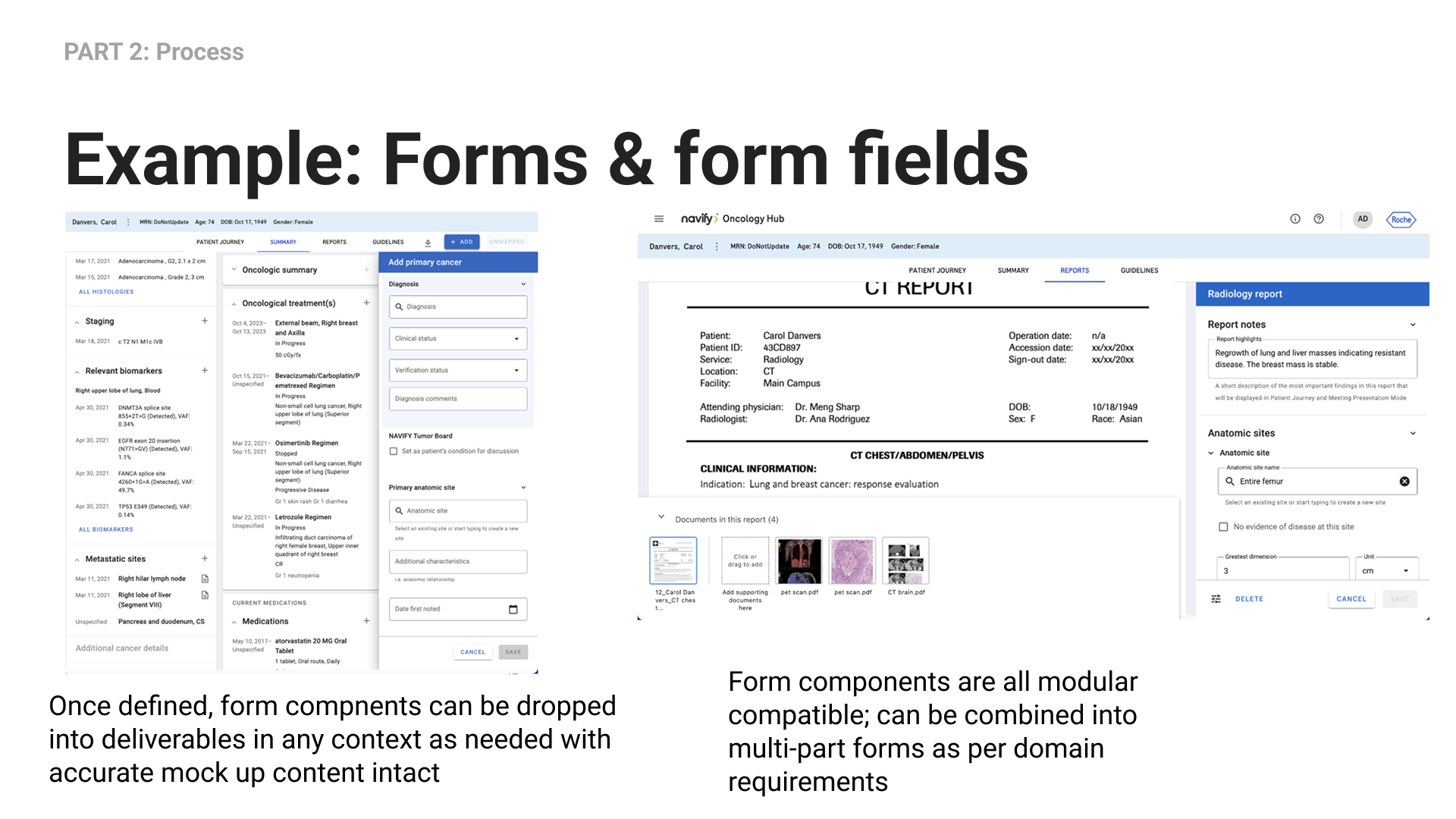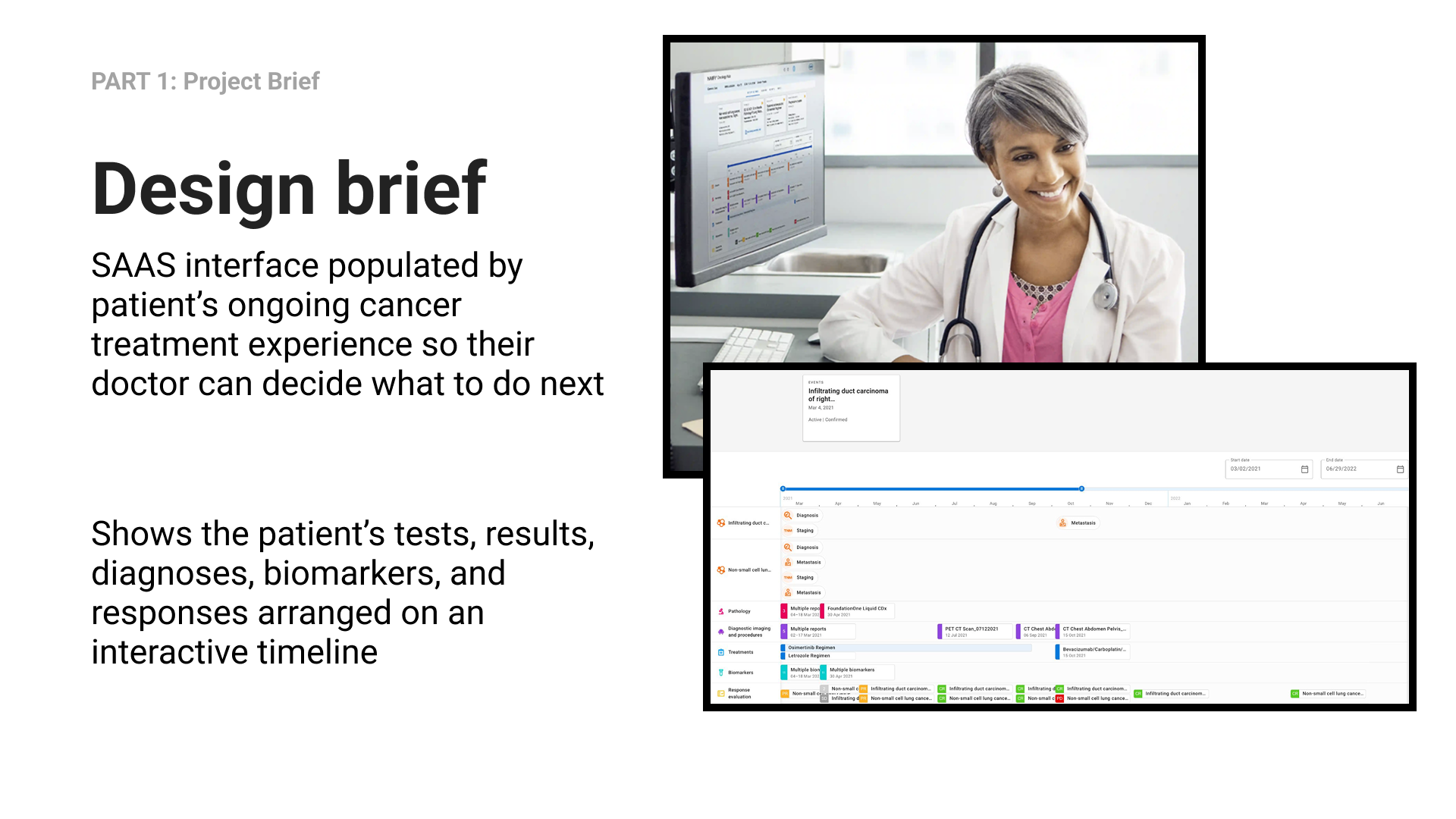 SAAS interface populated by patient’s ongoing cancer treatment experience so their doctor can decide what to do next. Shows the patient’s tests, results, diagnoses, biomarkers, and responses arranged on an interactive timeline