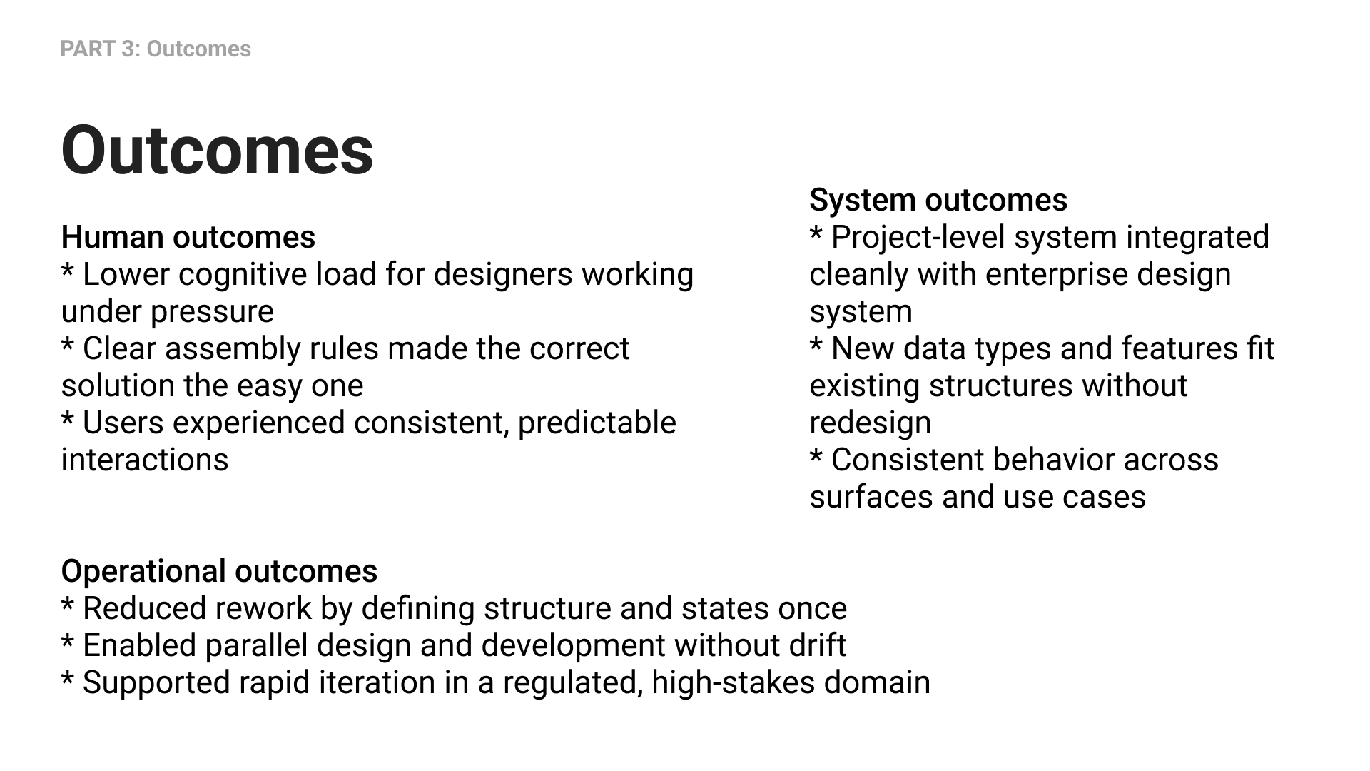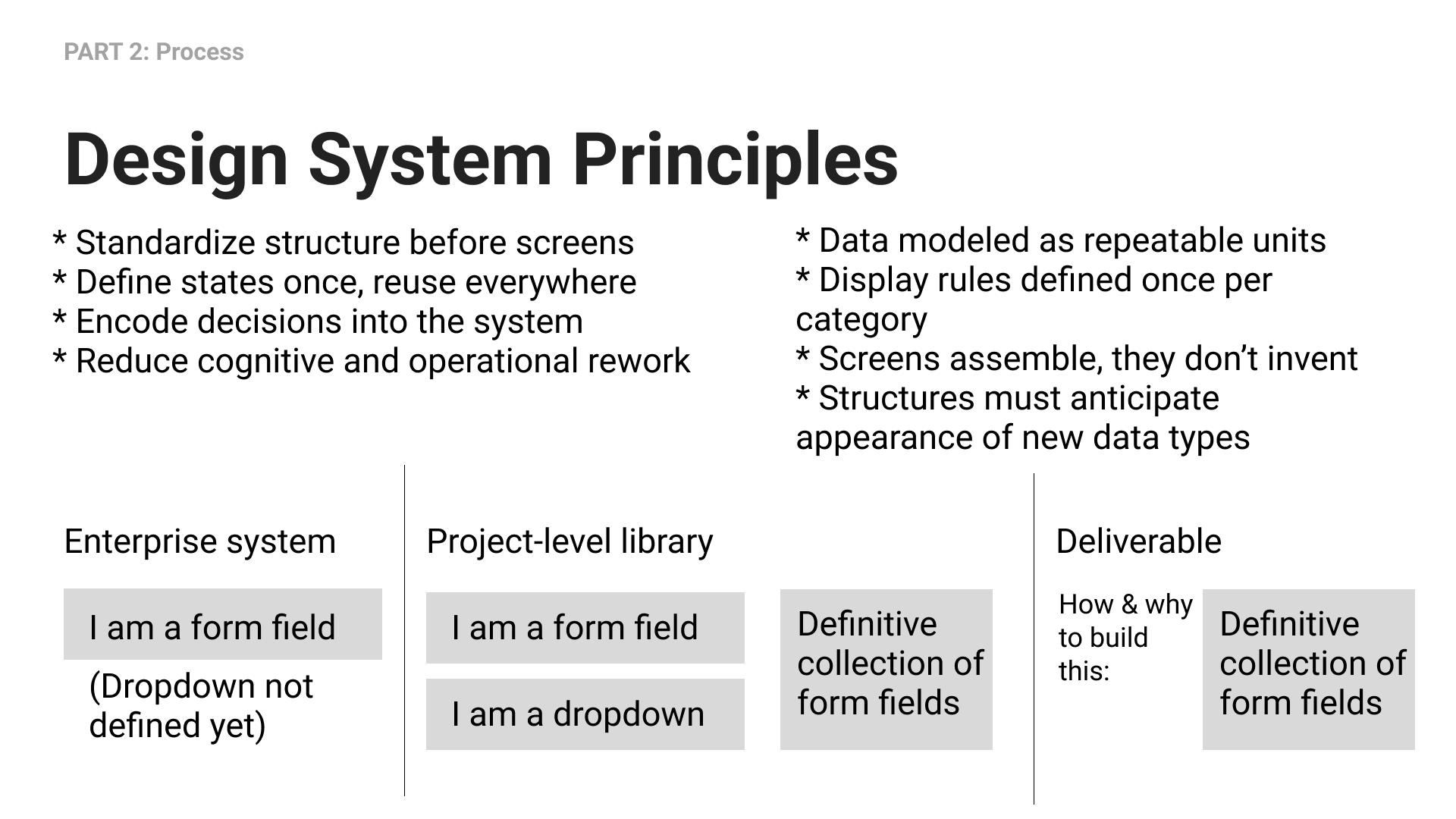 * Standardize structure before screens* Define states once, reuse everywhere* Encode decisions into the system* Reduce cognitive and operational rework