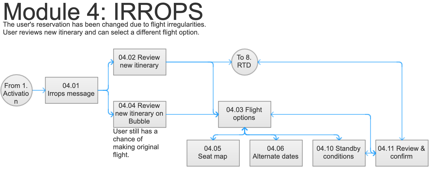 I broke the current flow down into segments (Kiosk activation, passengers, bags, upgrades, etc.), identified each step, and mapped how each segment linked to the next one. This gave the team a bird’s eye view of the entire process. I also introduced a numbering pattern to allow us to track each screen.